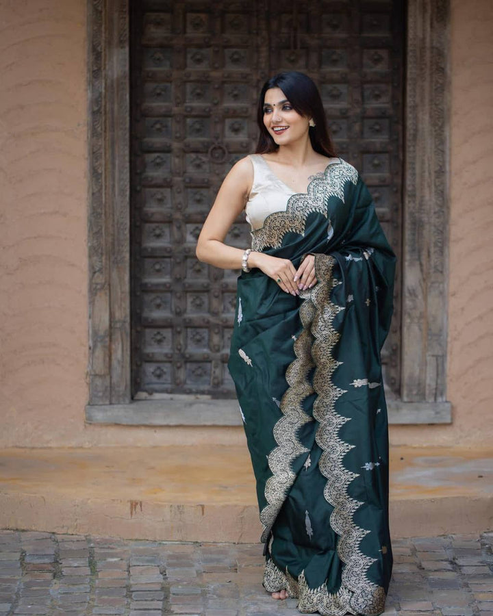 Bottle Green Colour Banarasi Litchi Silk Saree With Blouse Piece