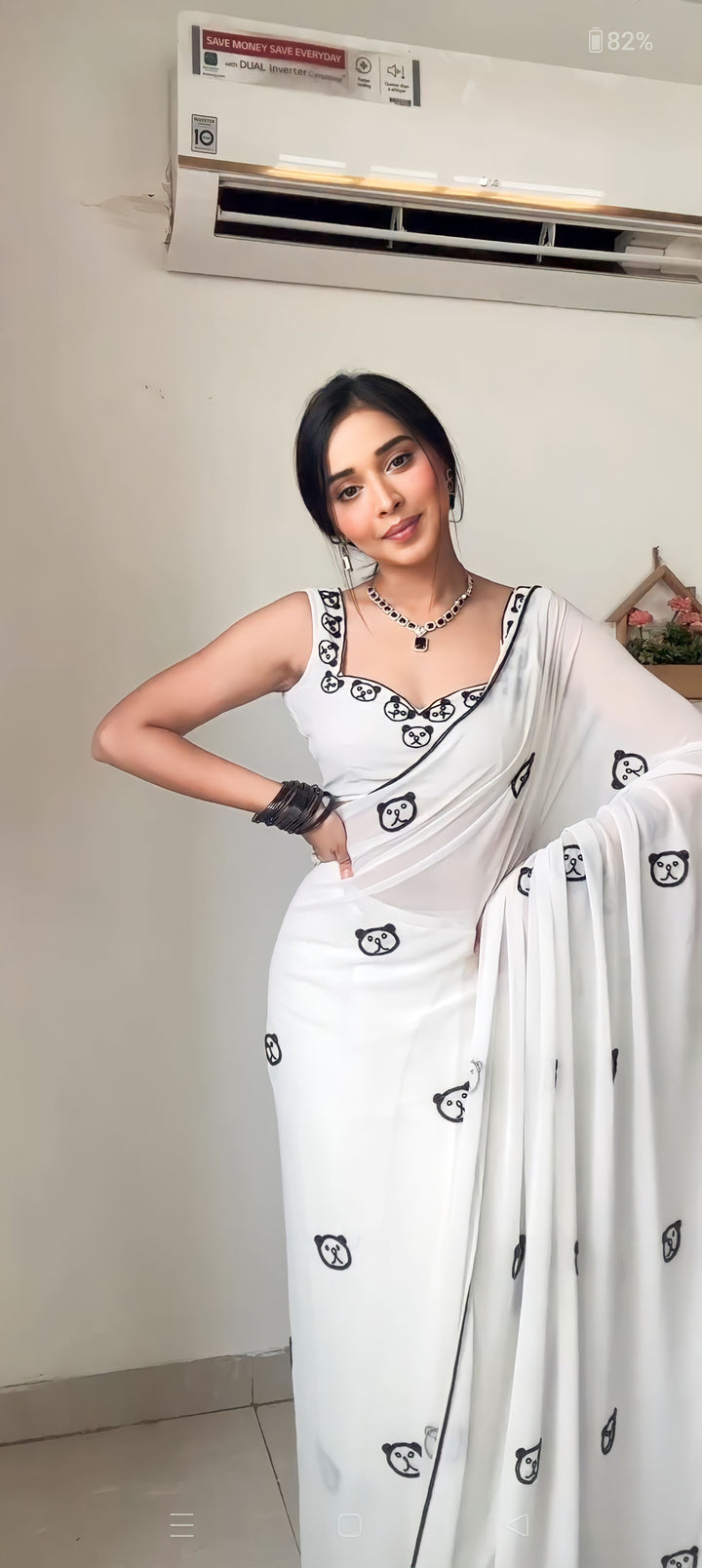 Devastating 1-Minute Ready To Wear White Printed Georgette Saree
