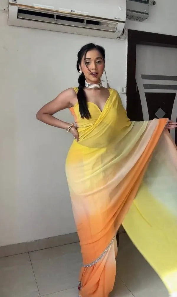 Yellow and Orange Colour 1-Min Georgette Ready To Wear Saree With Blouse Piece