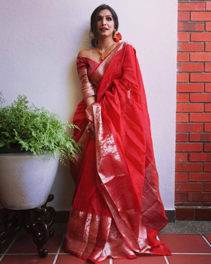 Red Colour Banarasi Litchi Silk Saree With Blouse Piece