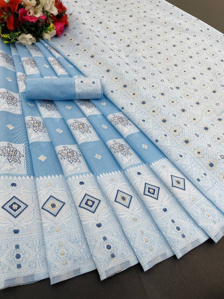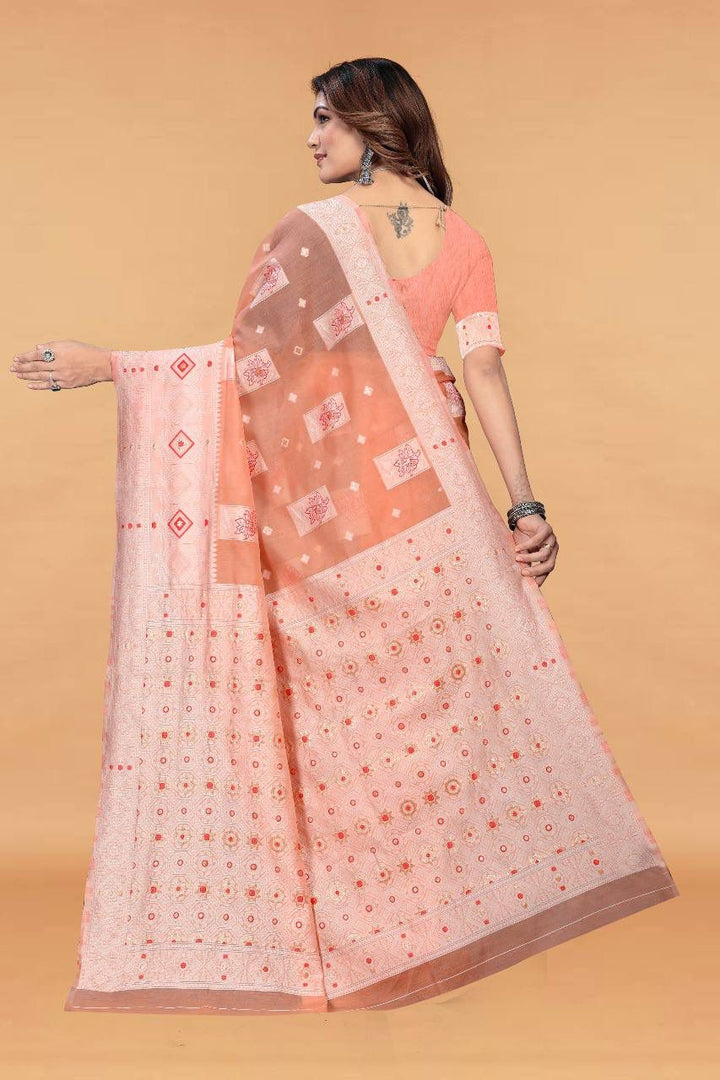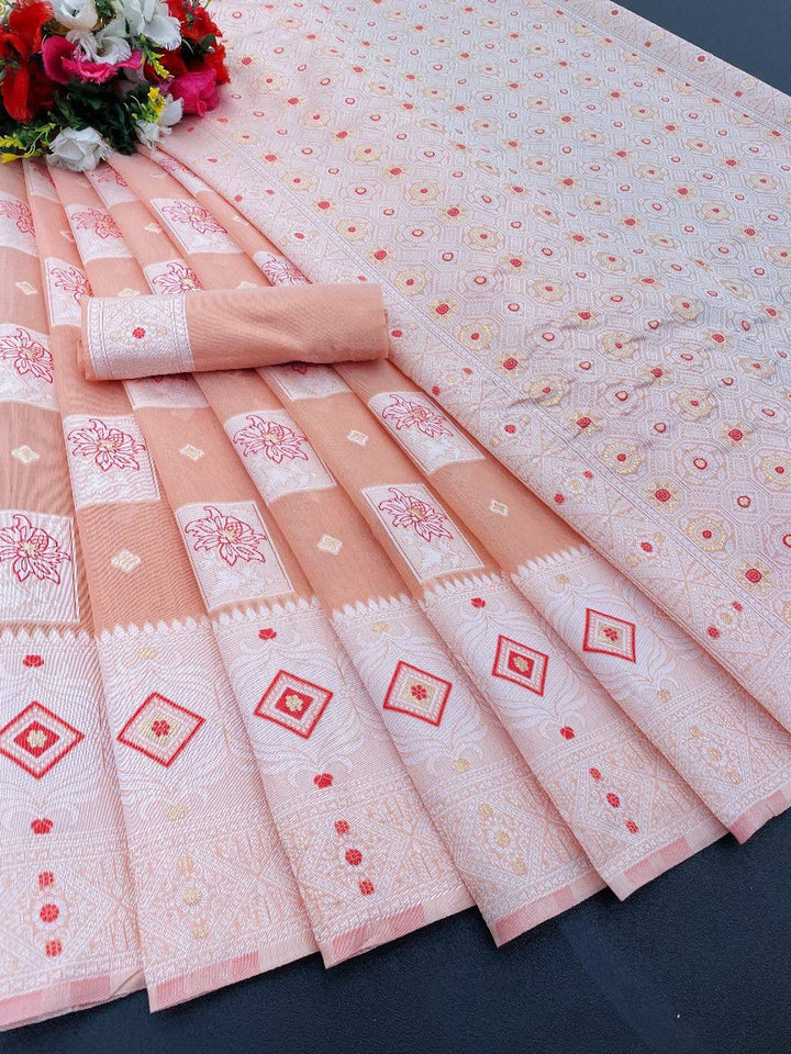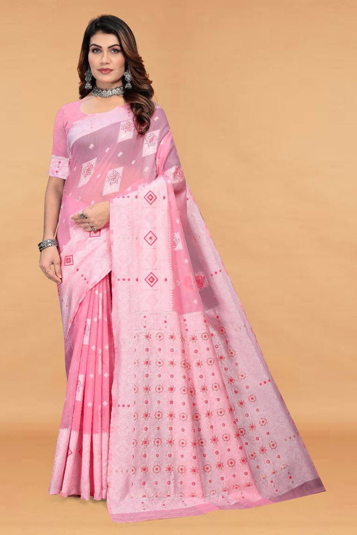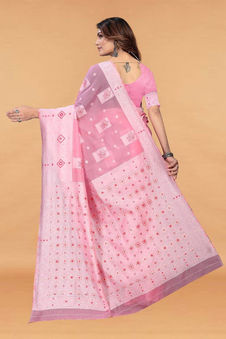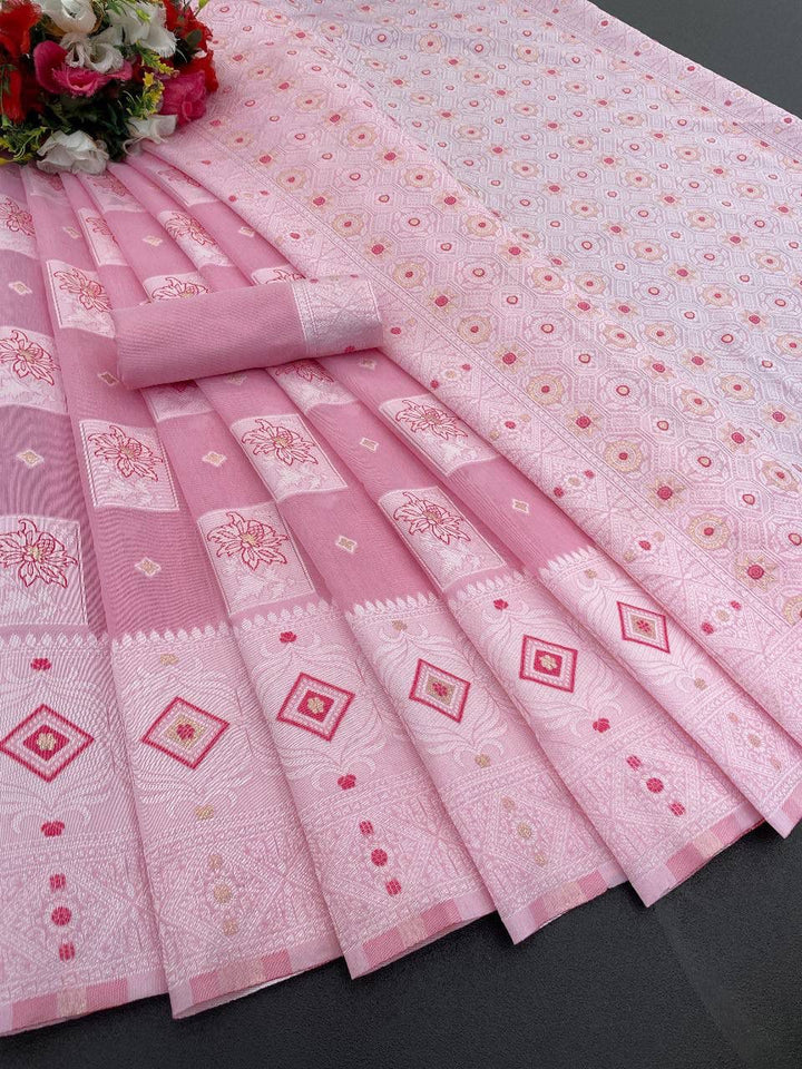 The pink color saree is designed with white resham and golden zari and copper zari made designer work all over the body. The pallu has white resham and golden zari and copper zari made designer work. white resham and golden zari and copper zari made designer border all along. blouse piece avilable.