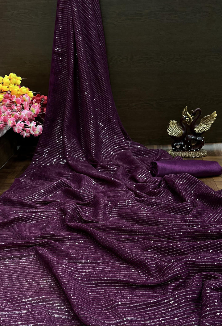 Wine Satin Fancy Sequence Work Saree